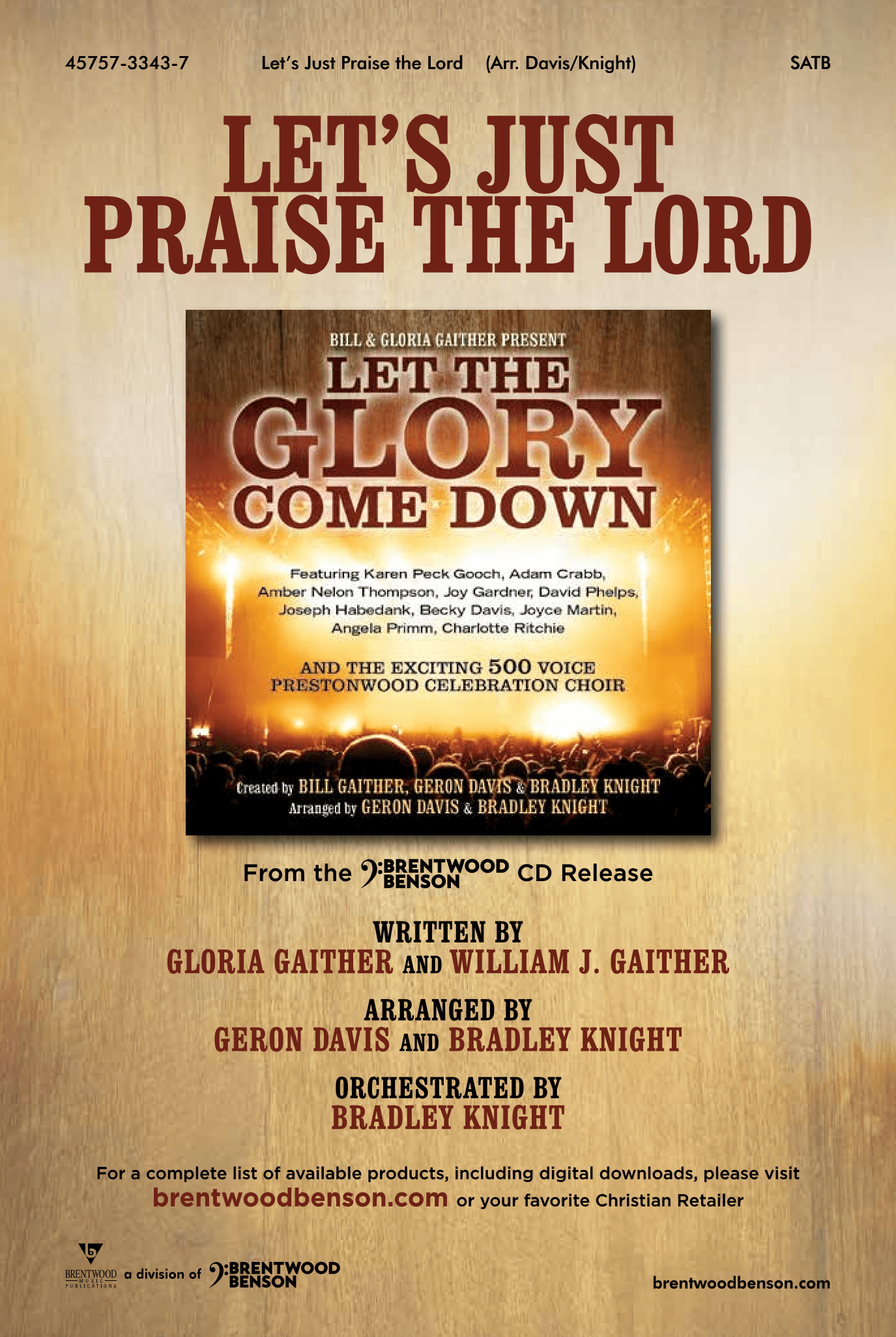 This arrangement by Geron Davis and Bradley Knight comes from the collection, Let the Glory Come Down. Featuring Southern Gospel great Karen Peck along with a Gaither Gospel choir, this song written by Bill & Gloria Gaither will energize your choir and congregation to praise the Lord.