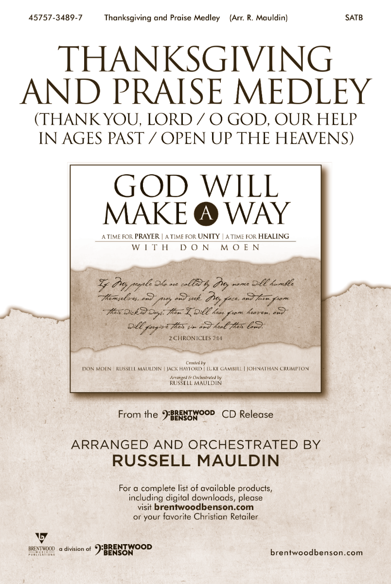 Originally presented in the God Will Make a Way project, from internationally-acclaimed worship leader Don Moen, the “Thanksgiving and Praise Medley” would be a poignant addition to any music ministry. Arranged by Russell Mauldin, this very powerful medley takes us through a time of thankfulness for God’s blessings to an upbeat time of prayer asking God to open the heavens as we pour out our praise.