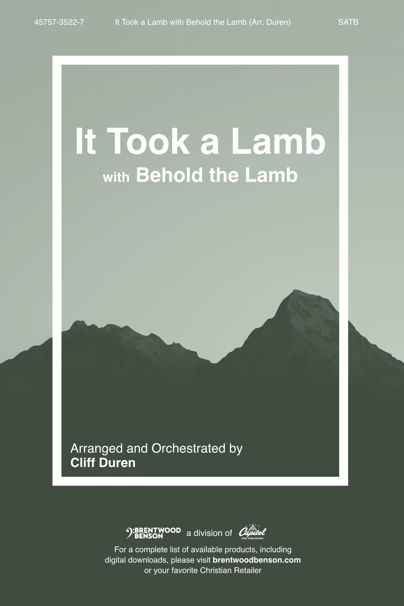 “It Took a Lamb with Behold the Lamb,” arranged and orchestrated by Cliff Duren, is a pairing of two of the most powerful songs about the cross that have ever been written. “It Took a Lamb” was composed by Geron Davis, with “Behold the Lamb” written by the late Dottie Rambo. Cliff brought both songs forward with a fresh and powerful arrangement that is certain to make an impact on your congregation.