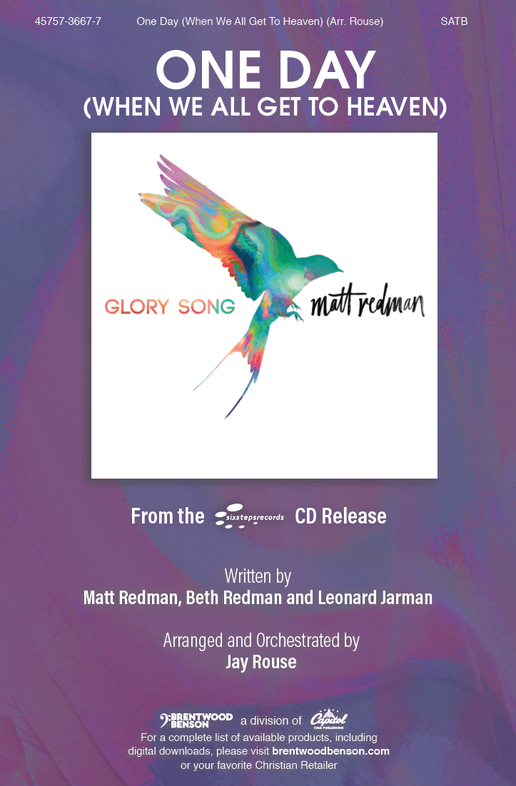 “One Day (When We All Get to Heaven)” reminds us of the timeless truth that we will join with our Father in heaven one day. On that day there will be no sickness, no pain, and no sin. That is why we sing—because we joyfully anticipate being reunited with our Savior. This song includes the classic hymn “When We All Get to Heaven” and would be perfect in any worship service slot or as a wonderful add-on to any worship collection during a time of reflection and praise. Wonderfully arranged by Jay Rouse.