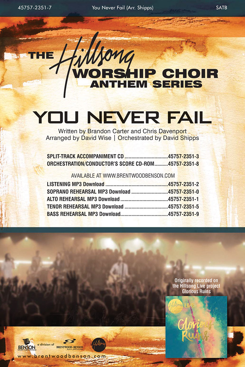 We are excited about this amazing song from the Hillsong Worship Choir Series. Released on their latest project Glorious Ruins, the song You Never Fail was written by Hillsong team writers Brandon Carter and Chris Davenport. This song is perfectly arranged for the modern worship choir to be used as a choir special, but can also be incorporated into your congregational worship service.