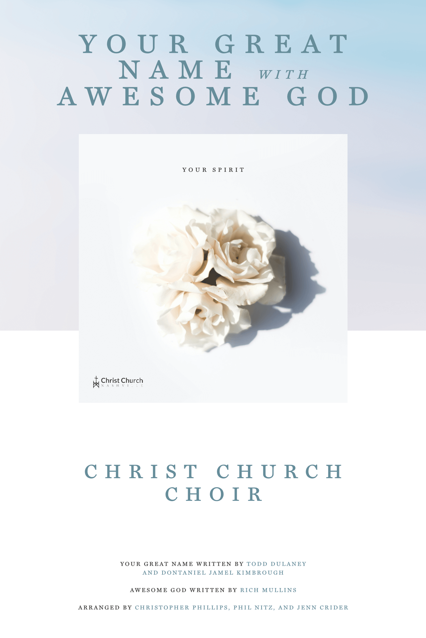 There’s something powerful that happens when we proclaim the great name of Jesus. The awesomeness of God is on full display in this passionate anthem, arranged by Christopher Phillips, Phil Nitz, and Jenn Crider—including a powerful inclusion of Rich Mullins’ classic worship chorus, “Awesome God.” Call on the name of the Lord and the powerful promises of God by singing, “Your Great Name with Awesome God.”