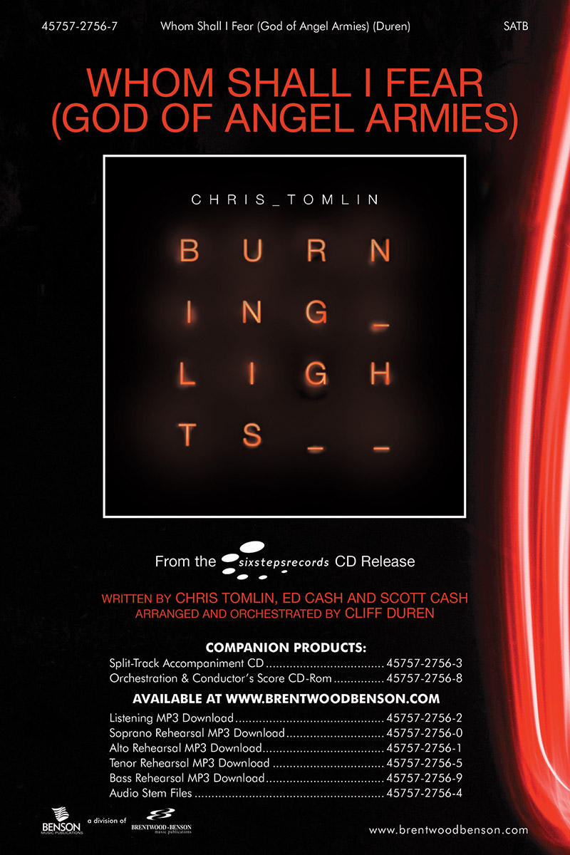 Whom Shall I Fear (God of Angel Armies) was written by Chris Tomlin, Ed Cash and Scott Cash. It debuted on CCLI higher than any other worship song in the history of CCLI. It is not only a worship favorite for churches all over the world, but it is a top Christian radio single from Chris Tomlin's latest project – Burning Lights.