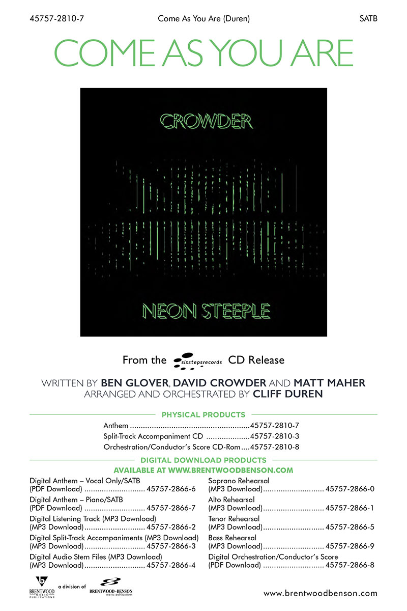From David Crowder's top worship album, Neon Steeple, this adaptable arrangement can either be a high-energy call to worship or a more subdued invitation at the end of a service. The moving lyrics penned by David Crowder, Matt Maher, and Ben Glover bring new meaning and importance to Christ's unending grace.