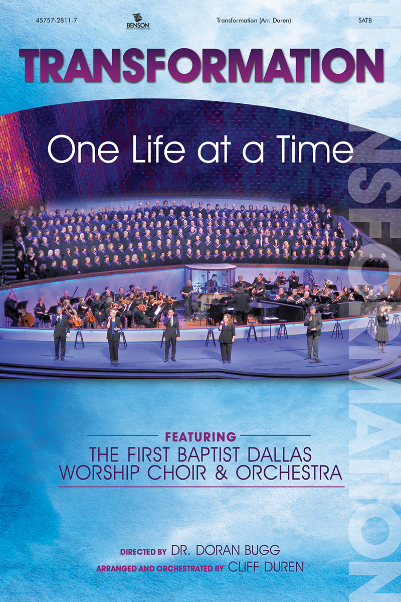 Brentwood-Benson Music Publications is delighted to present Transformation: One Life at a Time – featuring the First Baptist Dallas 240-voice choir and 45-piece orchestra and rhythm section directed by Dr. Doran Bugg (Minister of Music and Worship). Arranged and orchestrated by Cliff Duren, this collection contains 11 new songs with high energy, lush ballads, revisited hymns, and congregational moments. This broad collection offers a truly power-packed resource for the local church choir and orchestra! This special recording was captured during a live night of worship in the beautiful sanctuary of the First Baptist Dallas campus.