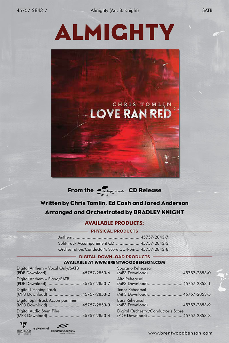 Originally recorded on the newest Passion CD, you can also hear this song on Chris Tomlin's newest CD release Love Ran Red. Given to top arranger Bradley Knight, this is a successful worship song for your choir, orchestra, and congregation.