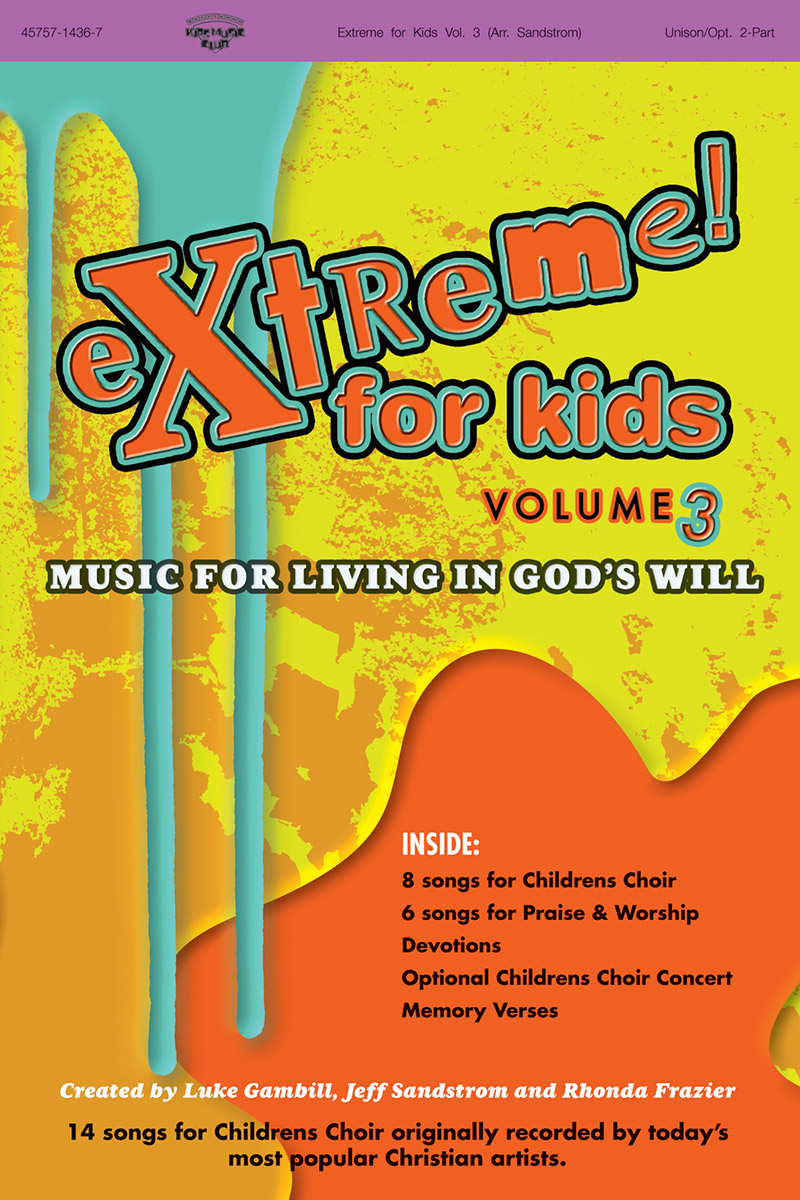 EXTREME FOR KIDS is back with an energetic Volume 3. Extreme For Kids Vol. 3 encourages your Children's Choir to become excited for Christ. Featuring 14 songs originally recorded by some of today's most popular Christian artists. Arranged by Jeff Sandstrom, your kids choir will love singing these fun arrangements of some of today's top Christian songs. Fill your Children's Choir and Praise & Worship time with music from this cutting-edge collection, which includes devotions and an optional Children's Choir Concert. This collection is sure to encourage and excite your choir to seek God's will!