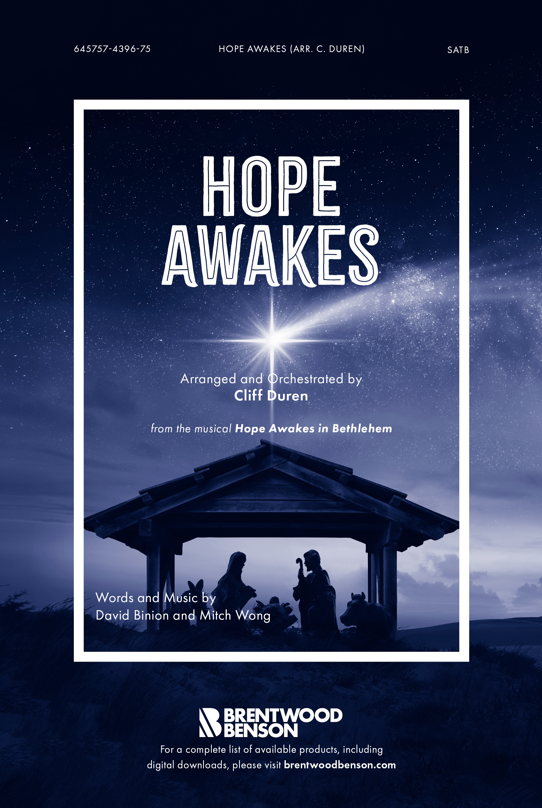 From arranger Cliff Duren, and also heard in his Christmas musical, Hope Awakes in Bethlehem, comes this worshipful ballad made popular by David and Nicole Binion. Hope Awakes sweetly, yet powerfully, reminds us of the Word made alive as a baby in a manger and invites us to come and adore this infant of majesty.